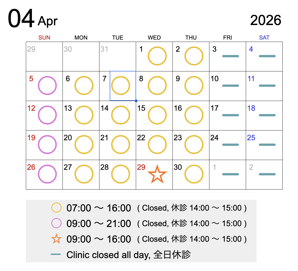 We open the clinic on weekdays 7:00 AM – 4:00 PM, and, on Sunday including 9:00 AM – 9:00 PM.