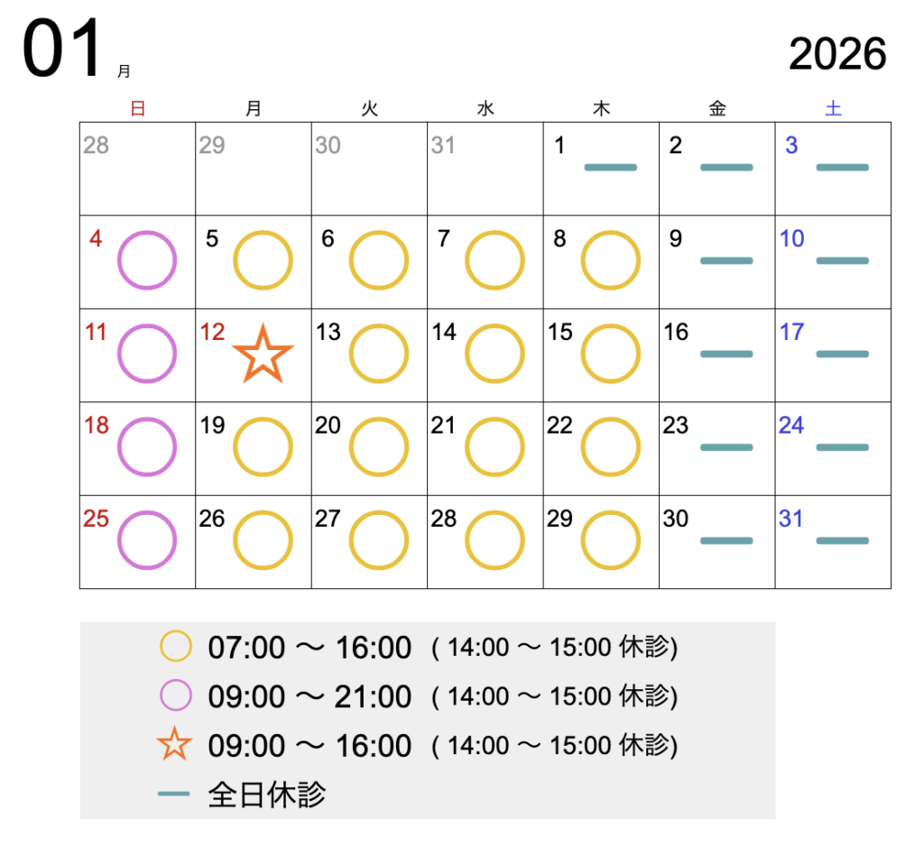 ◆臨時休診:12/29-12/30短縮営業, 12/31-1/3全日休診